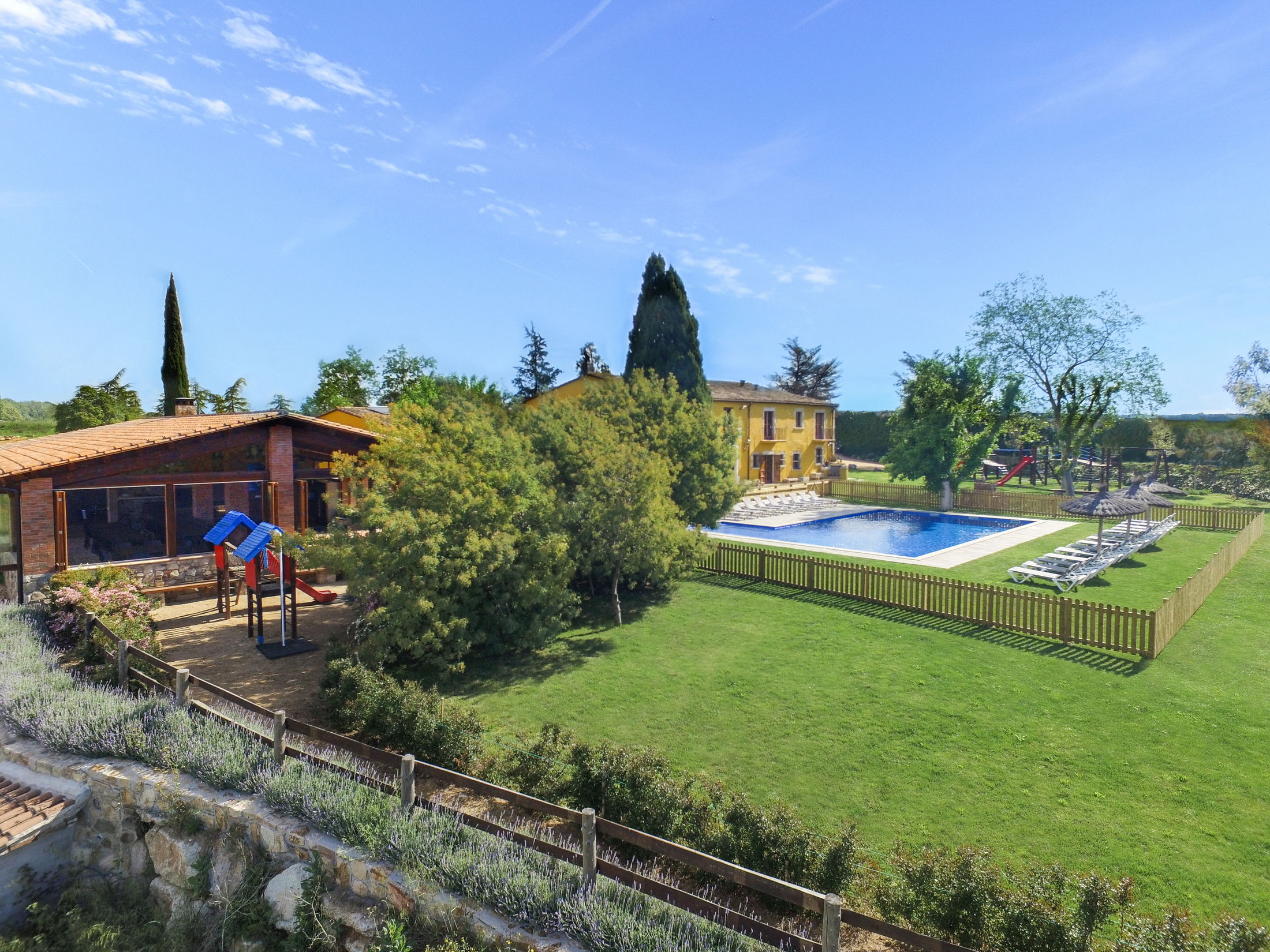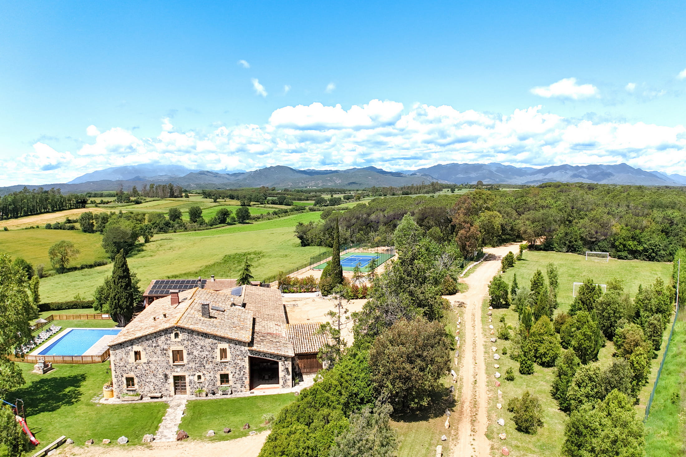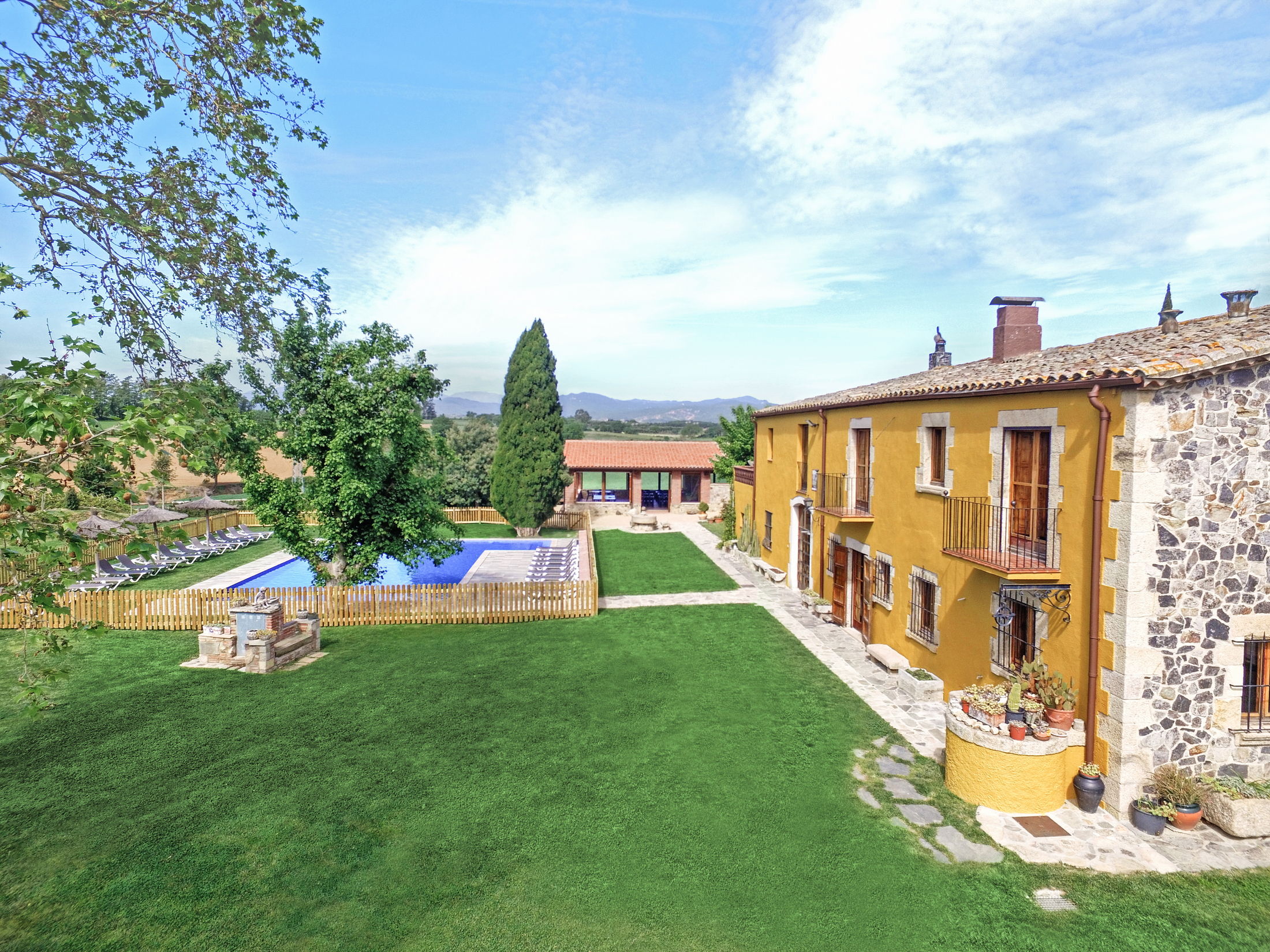 Villa Mas Sant Jordi permet de vous réunir avec toute votre famille ou bien un groupe d’amis afin de passer des vacances de rêve. Cette grande et belle Maison de Vacances peut accueillir jusqu’à 40 personnes en 15 chambres avec climatisation. En plus la villa pour large groupes vous offre des très jolies vues. Barcelone se trouve à 45 min et les plages dorées de la Costa Brava à 15 minutes.